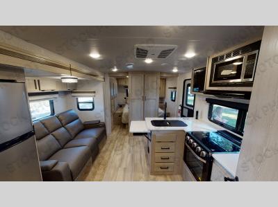 This is the perfect travel trailer for two people looking for comfortable camping trips! You will have your own RV queen bed to sleep on in the front private bedroom, and an optional TV can be added if you enjoy the morning news in bed. Breakfast can be made on the three-burner cooktop, or head outdoors to cook on the outside kitchen. The theater seating with tables will provide a place to relax and dine together, and the spacious full rear bath will allow you to clean up before you head out for the day. This model includes plenty of storage space, including two pantries, a wardrobe slide out in the bedroom, plus a drop-frame pass-through storage for larger camp gear!