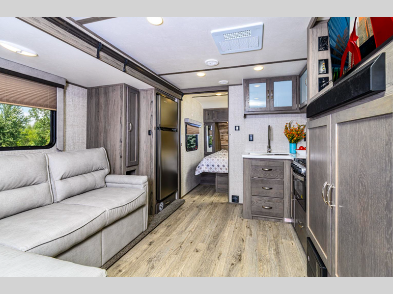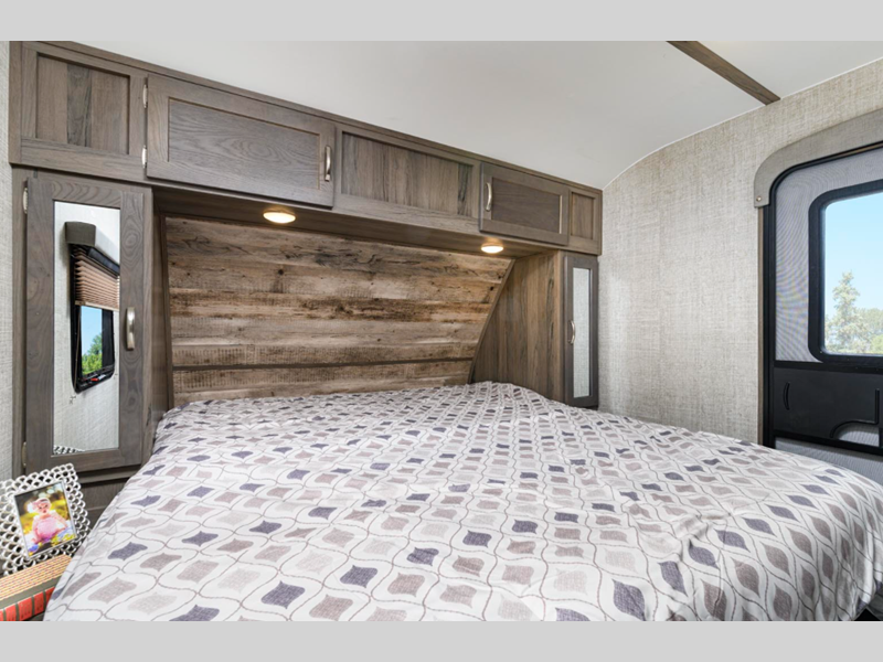 Sleeps 5 Slides 1 Length 31 ft 5 in Ext Width 8 ft Ext Height 11 ft Int Height 6 ft 8 in Hitch Weight 740 lbs Dry Weight 5957 lbs Cargo Capacity 2042 lbs Fresh Water Capacity 51 gals Grey Water Capacity 72 gals Black Water Capacity 36 gals Furnace BTU 35000 btu Available Beds Queen Refrigerator Type 12V Refrigerator Size 10.7 cu ft Cooktop Burners 3 Shower Size 30" x 36" Number of Awnings 1 LP Tank Capacity 20 lbs Water Heater Type Tankless AC BTU 15000 btu TV Info LR 40" HDTV Awning Info Power with LED Lighting Axle Count 2 Number of LP Tanks 2 Shower Type Walk-In Shower Electrical Service 35 amp Solar Wattage 100 watts Similar Floorplans