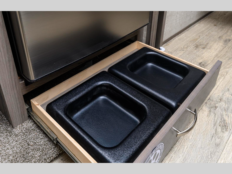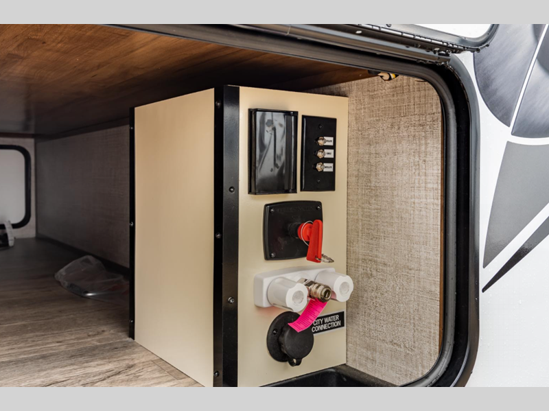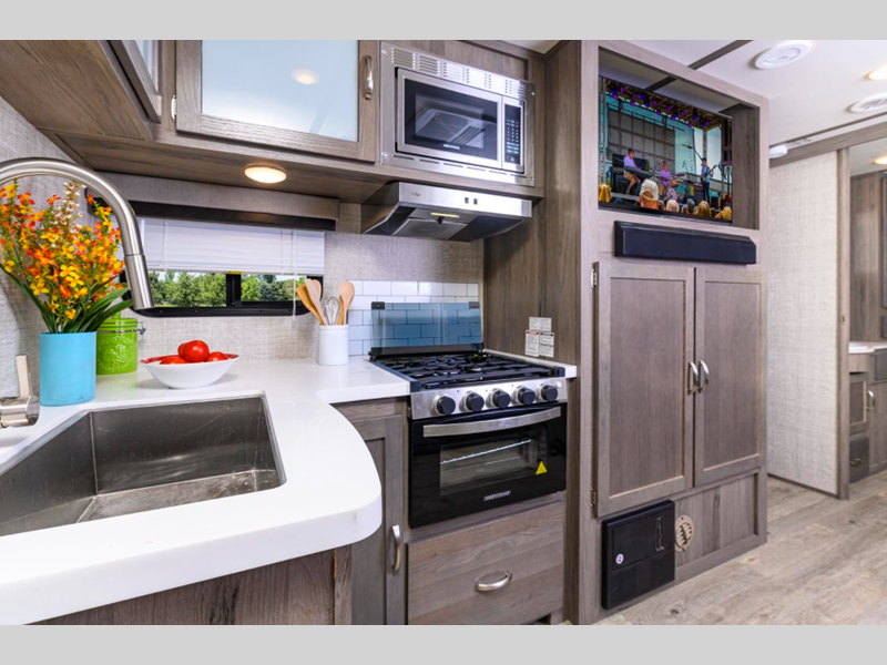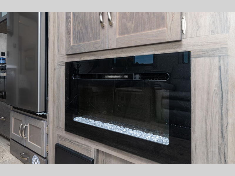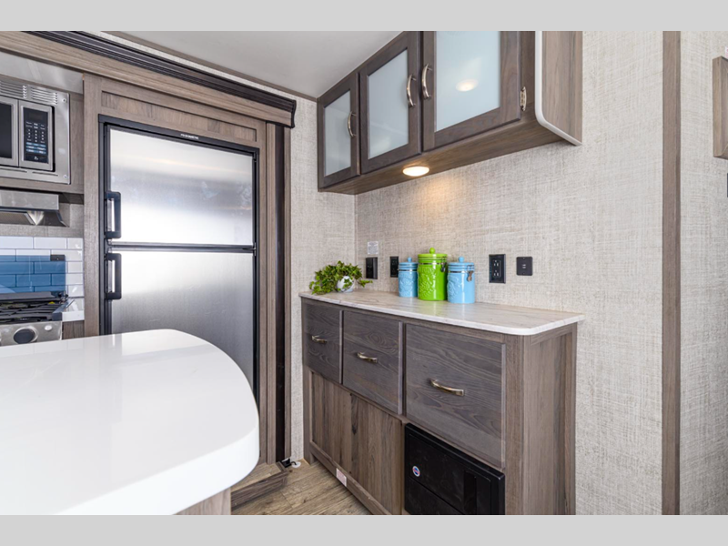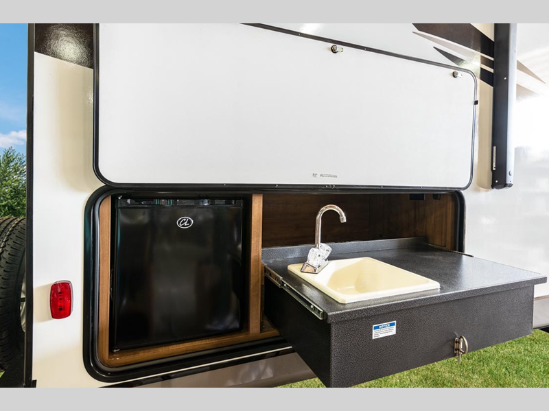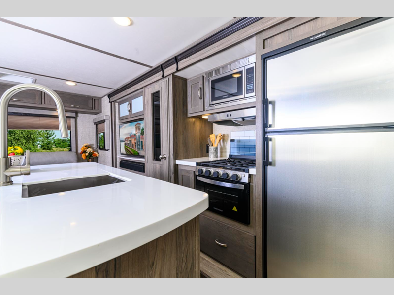 Some of the luxury features that are sure to catch your attention are the stainless steel appliances, the solid surface kitchen countertops, and the solid wood cabinet doors and stiles. A power tongue jack and exterior docking station will make set-up easier than ever, and the walk-on roof with a ladder will allow you to easily clean the top of your trailer after staying at the campground.
