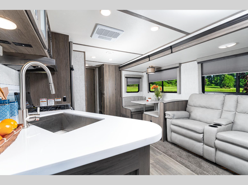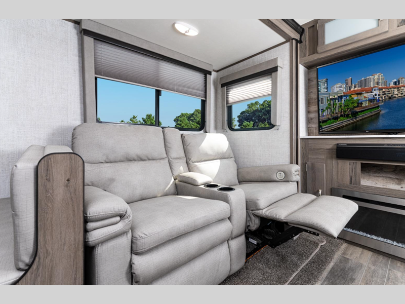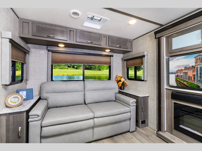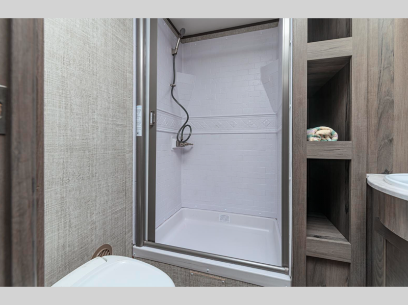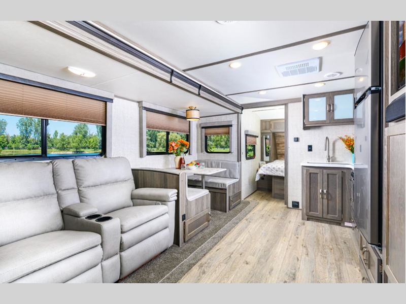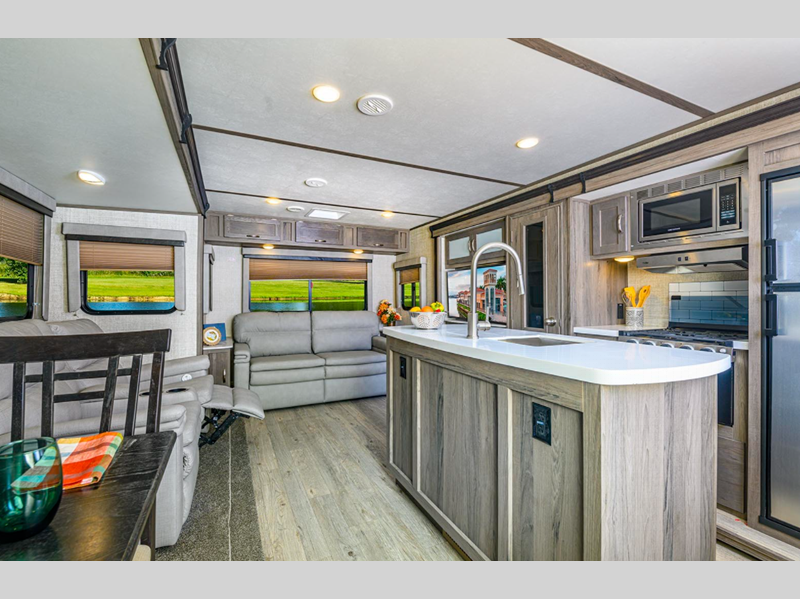 Sleeps 7 Slides 2 Length 34 ft 4 in Ext Width 8 ft Ext Height 11 ft 6 in Int Height 6 ft 8 in Hitch Weight 920 lbs Dry Weight 7117 lbs Cargo Capacity 2603 lbs Fresh Water Capacity 51 gals Grey Water Capacity 36 gals Black Water Capacity 36 gals Furnace BTU 35000 btu Available Beds Queen Refrigerator Type 12V Refrigerator Size 10.7 cu ft Cooktop Burners 3 Shower Size 30" x 36" Number of Awnings 1 LP Tank Capacity 20 lbs Water Heater Type Tankless AC BTU 15000 btu TV Info LR 40" TV Awning Info Power with LED Lighting Axle Count 2 Number of LP Tanks 2 Shower Type Walk-In Shower Electrical Service 35 amp Solar Wattage 100 watts Similar Floorplans