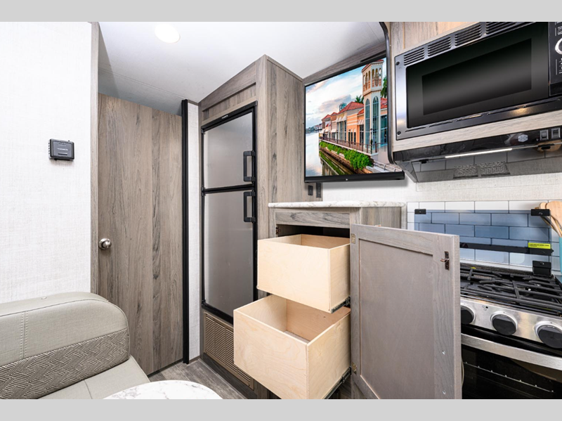 Sleeps 3 Slides 1 Length 23 ft 1 in Ext Width 7 ft 6 in Ext Height 10 ft 2 in Int Height 6 ft 11 in Hitch Weight 325 lbs Dry Weight 3395 lbs Cargo Capacity 976 lbs Fresh Water Capacity 30 gals Grey Water Capacity 33 gals Black Water Capacity 33 gals Tire Size 14" Furnace BTU 19000 btu Available Beds Queen Refrigerator Type 12V Refrigerator Size 8 cu ft Cooktop Burners 3 Shower Size 32" Number of Awnings 1 LP Tank Capacity 20 lbs Water Heater Type Tankless AC BTU 15000 btu Awning Info Electric w/LED Lights Axle Count 1 Number of LP Tanks 2 Shower Type Radius Electrical Service 30 amp Similar Floorplans