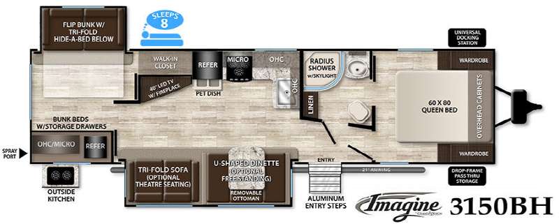 Take the whole gang along in this Grand Design Imagine bunkhouse travel trailer featuring double slides, plus an outdoor kitchen for the chef in the bunch to enjoy!